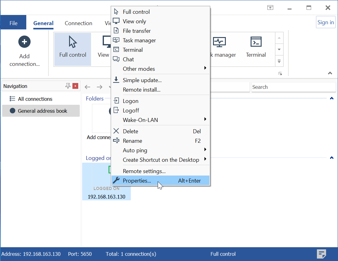 - Στον Viewer κάντε δεξί κλικ στη σύνδεση στόχου στο βιβλίο διευθύνσεων σας και επιλέξτε Ιδιότητες: