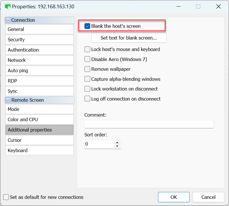 - Μεταβείτε στις Επιπλέον ιδιότητες, επιλέξτε Κενώστε την οθόνη του Host και κάντε κλικ στο OK.