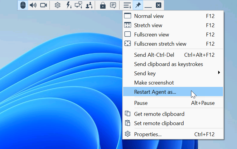 - フルコントロールと表示モードのツールバーでドロップダウンメニューをクリックし、管理者としてエージェントを再起動を選択します。