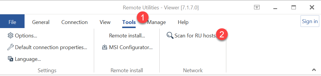 - Viewer에서 도구 탭을 열고 RU 호스트 검색을 클릭합니다: