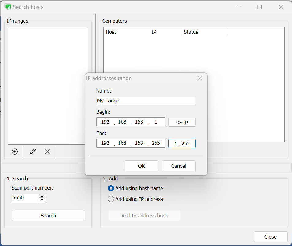 - 스캔할 IP 주소 또는 IP 주소 범위를 입력하고 OK를 클릭합니다: