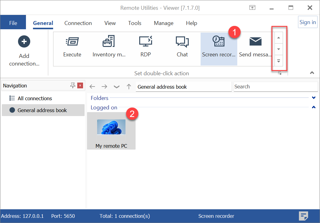 - 일반 탭에서 스크린 레코더를 선택하고, 주소록에서 연결을 더블 클릭합니다: