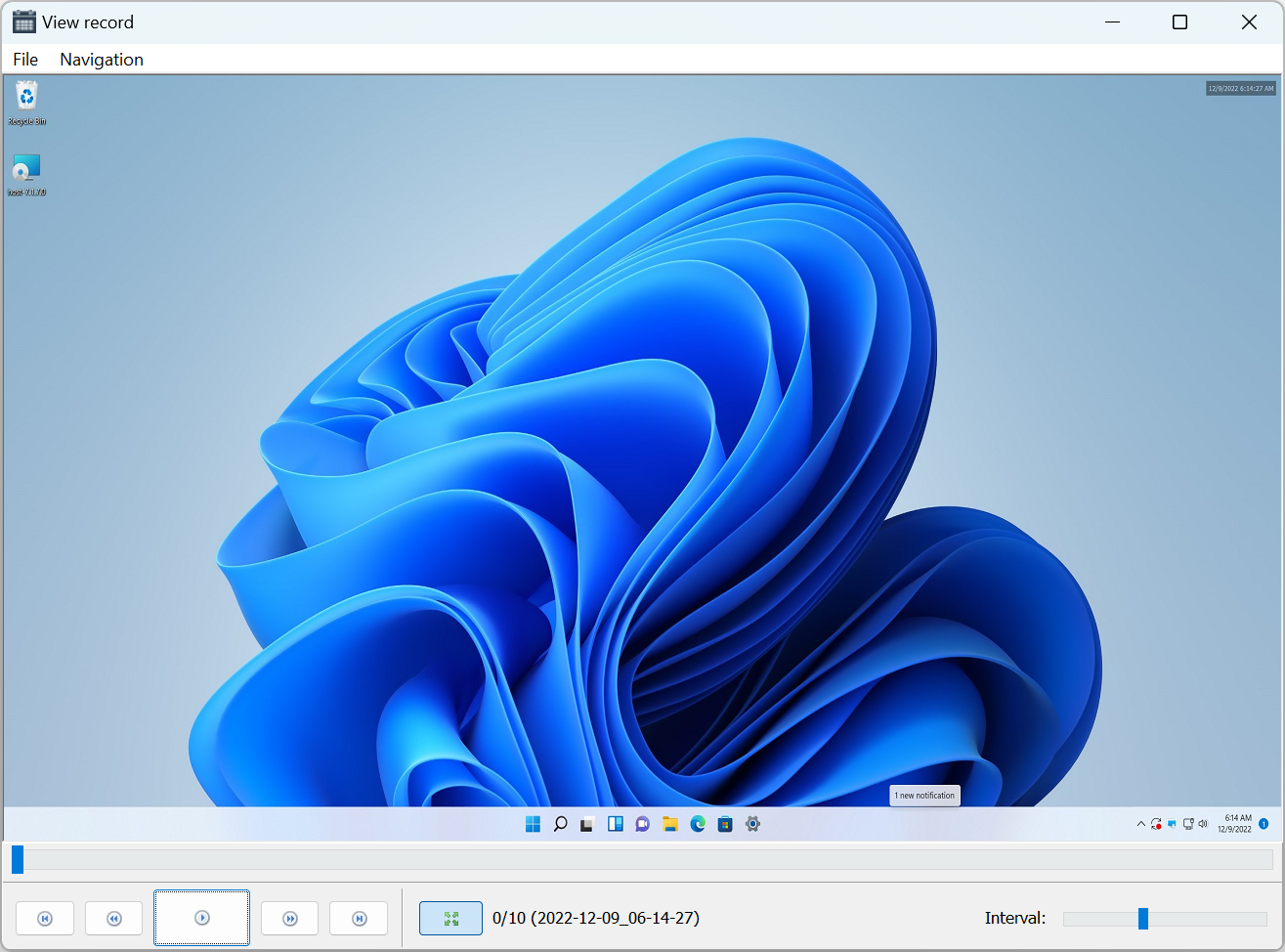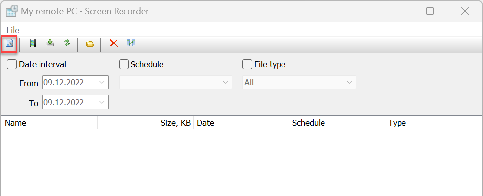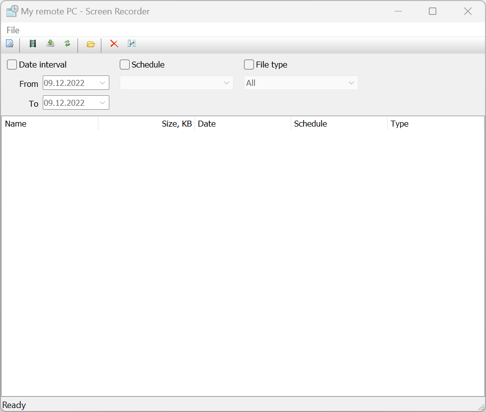 - 스크린 레코더 창이 열립니다. 이 창을 사용하여 스크린샷 촬영 일정을 설정하고 스크린샷을 저장하는 컨테이너 파일을 볼 수 있습니다.
