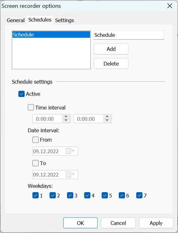 스크린샷 촬영 프로세스가 실행되도록 하려면 최소한 하나의 일정을 만들고 활성화해야 합니다. 여러 일정을 추가하려면 추가 버튼을 사용하세요.
