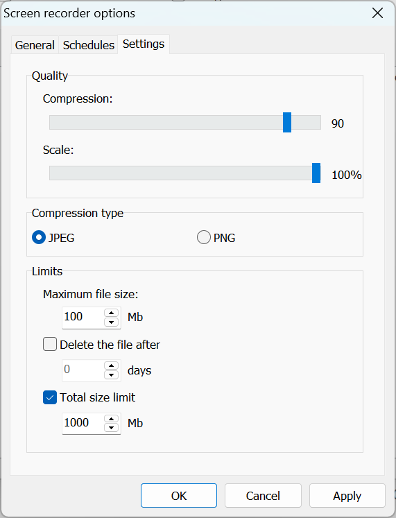 - 일반 탭으로 이동하여 사용을 선택합니다. 프로그램이 스크린샷을 찍어야 할 간격을 설정합니다:
