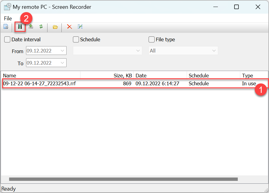 - 스크린 레코더 창에서 보고 싶은 컨테이너 파일을 선택하고 파일 보기 아이콘을 클릭합니다: