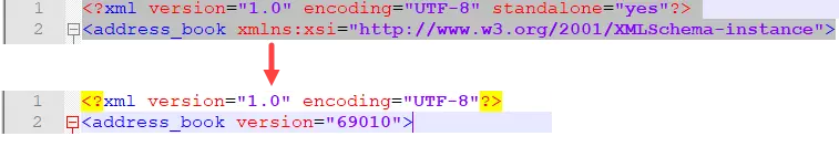 my_address_book.xml파일을 XML 편집기에서 열고 첫 번째 두 행을sample_book.xml파일의 해당 행으로 교체합니다. 주소록 파일을 저장하고 닫습니다.