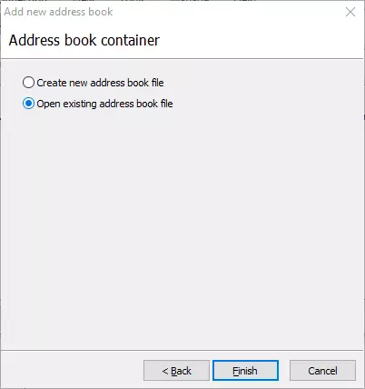 - Open existing address book file을 선택하고 Finish를 클릭합니다: