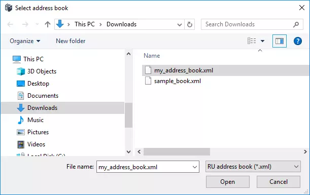 - 저장된 XML 파일로 이동하여 Open을 클릭합니다. 그런 다음 주소록 관리자를 닫습니다.