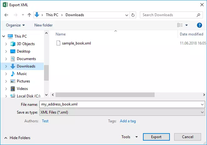 시작하기 위해 샘플 XML 코드를 생성해야 합니다. 가장 쉬운 방법은 샘플 레코드로 새 주소록을 만드는 것입니다: