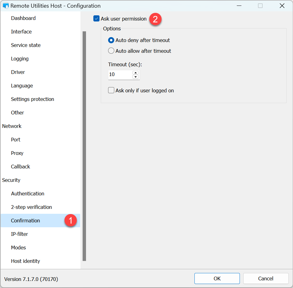 Dengan ciri Tanya kebenaran pengguna dihidupkan, satu mesej akan dipaparkan di PC jauh yang meminta pengguna jauh untuk menerima atau menolak sambungan yang masuk: