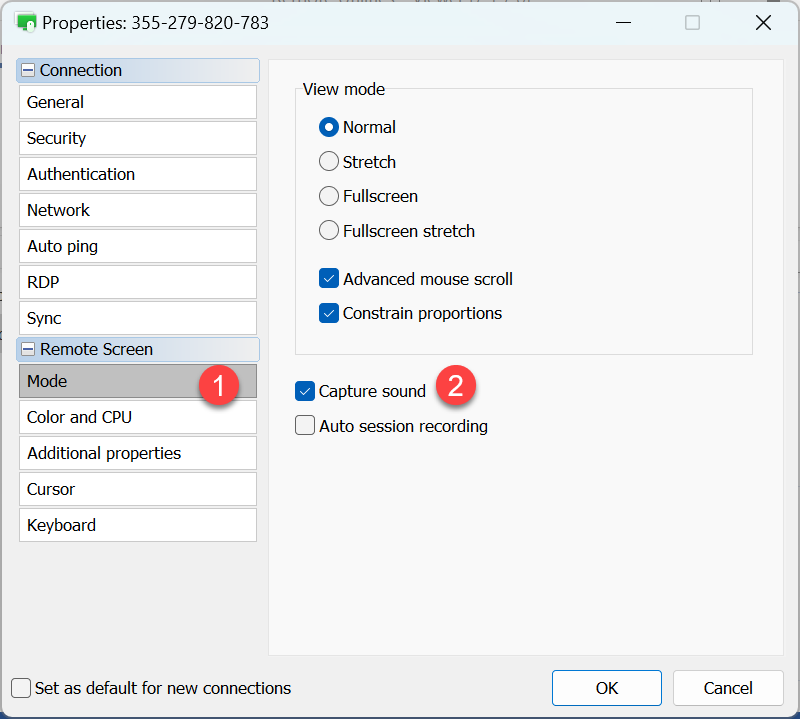 - Dalam sifat sambungan, pergi ke Mod dan hidupkan pilihan Penangkapan bunyi: