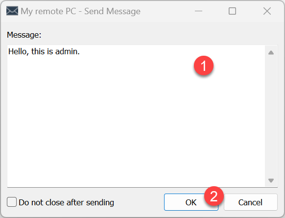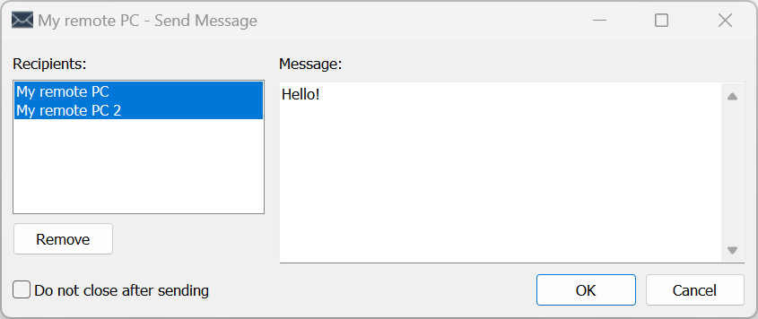 - Het Bericht verzenden venster wordt geopend met een lijst van doelcomputers aan de linkerkant. Typ uw bericht in en klik op OK om het bericht naar de ontvangers te verzenden:
