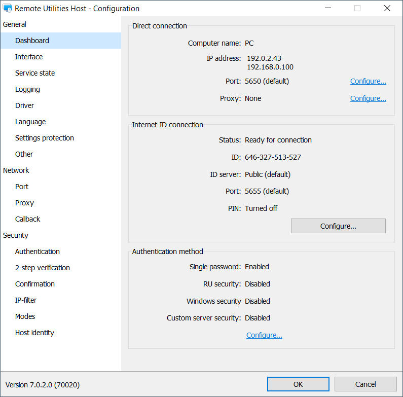 The Dashboard shows you the most important connectivity and authentication parameters for the Host in one place: