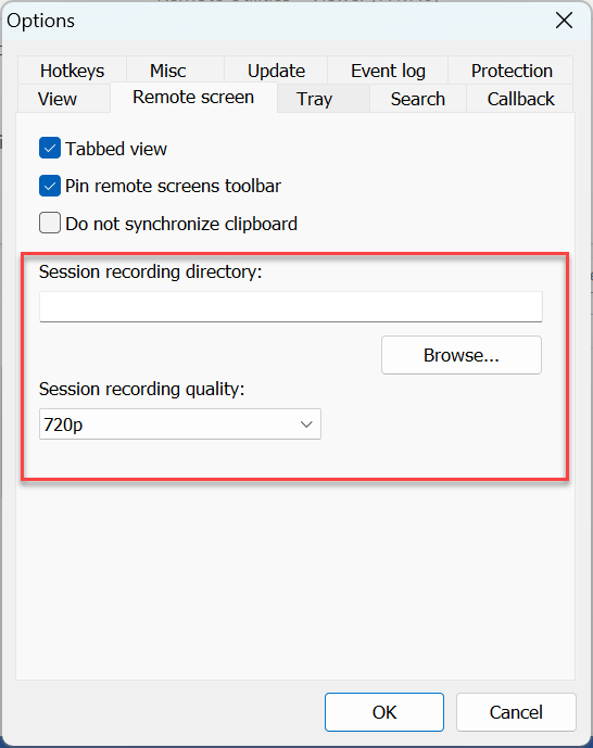 - Session recording quality—set video quality. Available options are 1024x768, 720p and 1080p.