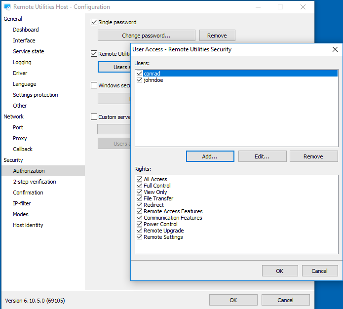 However, you can also set user-specific permissions but in this case you must enable an authorization method that allows you to assign permissions to users. These are RU Security, Windows Security and Custom Server security. With Single password authorization though you won't be able to set permissions because there are no user accounts per se.
