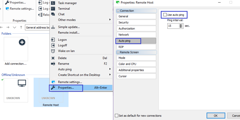 2) In the connection properties window, go to the Auto-ping section and deselect the checkbox: