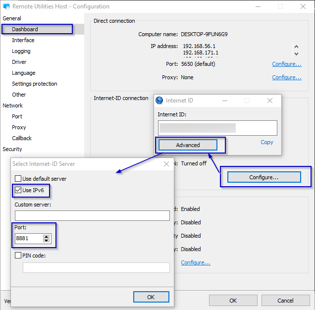 Open the Settings for Host window and navigate to the Dashboard tab. Then click the Configure button in the Internet-ID connection section and sel ect Advanced -> Select Internet-ID Server. In the invoked window please check if you have the Use IPv6 checkbox enabled and if there's a correct port number specified: