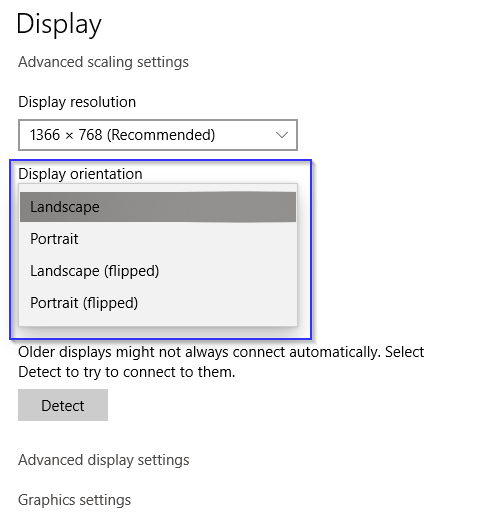 In addition, please try changing the Display orientation value on the remote Host machine. This setting can be found in the Display settings menu: