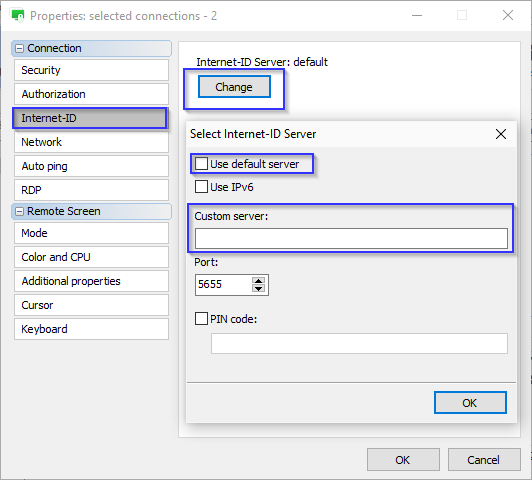 2. Navigate to the Connection tab, sel ect Internet-ID connection and click Change button.