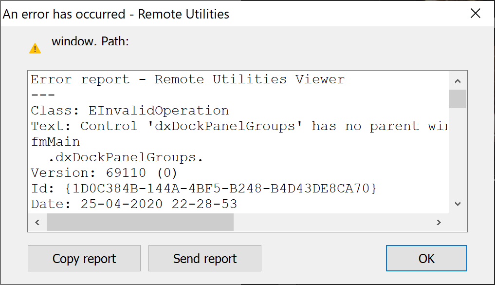 This issue might occur if there was a downgrade/return to an older Remote Utilities version or if the VIewer configuration file somehow got corrupted (perhaps, by some antivirus software activity).