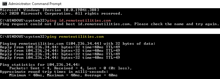 As you can see from that attached image, I can ping REMOTEUTILITIES.COM all day long, but NOT id.remoteutilties.com.