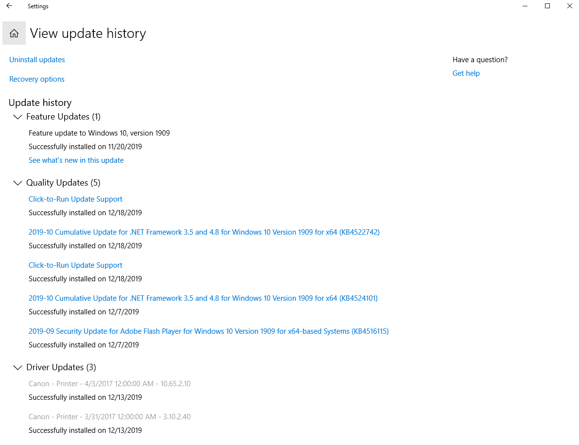 All PCs running latest Windows 10 Pro version 1903 build 18362.476