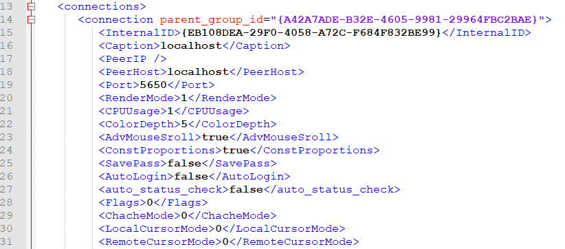 The <connections> tag encloses connections that represent remote computers. Each connection is marked with the <connection> tag. The <connection> tag has the parent_group_id attribute that refers to the unique ID of the folder where this connection is located.