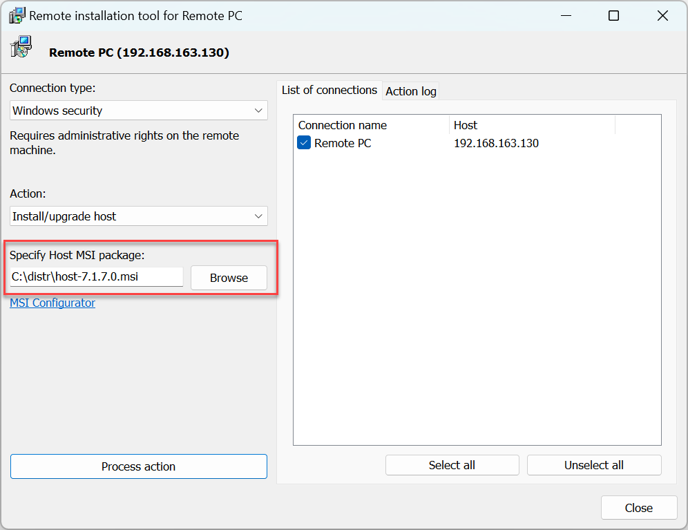 - ระบุแพ็คเกจ MSI ของ Host—ซึ่งอาจเป็นแพ็คเกจ Host ปกติหรือแพ็คเกจที่กำหนดเองที่สร้างด้วย ตัวกำหนดค่า MSI.
