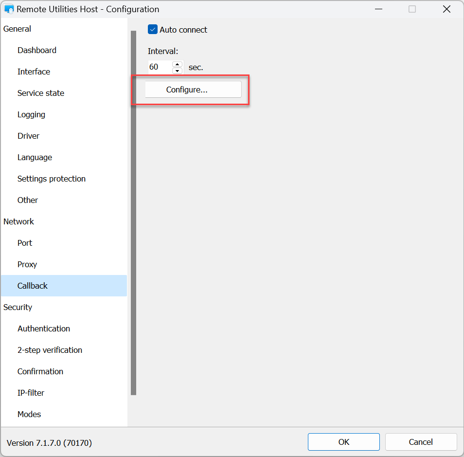 - 自动连接 — 选中后,Host 将根据在 主机设置 ➝ 网络 ➝ 回呼 选项卡中设置的间隔自动发送连接请求