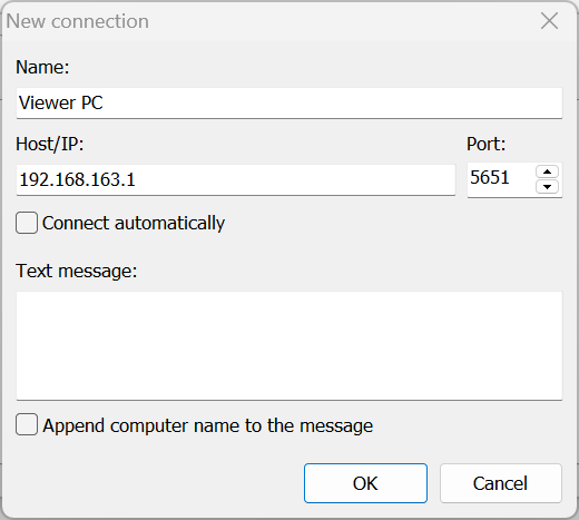 - 新连接 对话框将出现。在 Host/PC 字段中输入 Viewer 的 IP 地址或 DNS 名称。根据需要选择或取消选择其他选项,然后单击 确定: