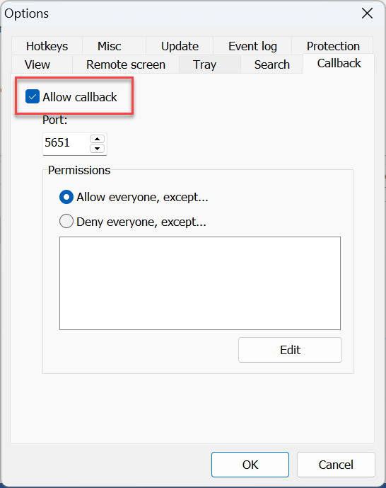 确保在 Viewer 和 Host 的两侧使用相同的回呼端口。此外,必须在 Viewer PC 的防火墙中允许该端口。