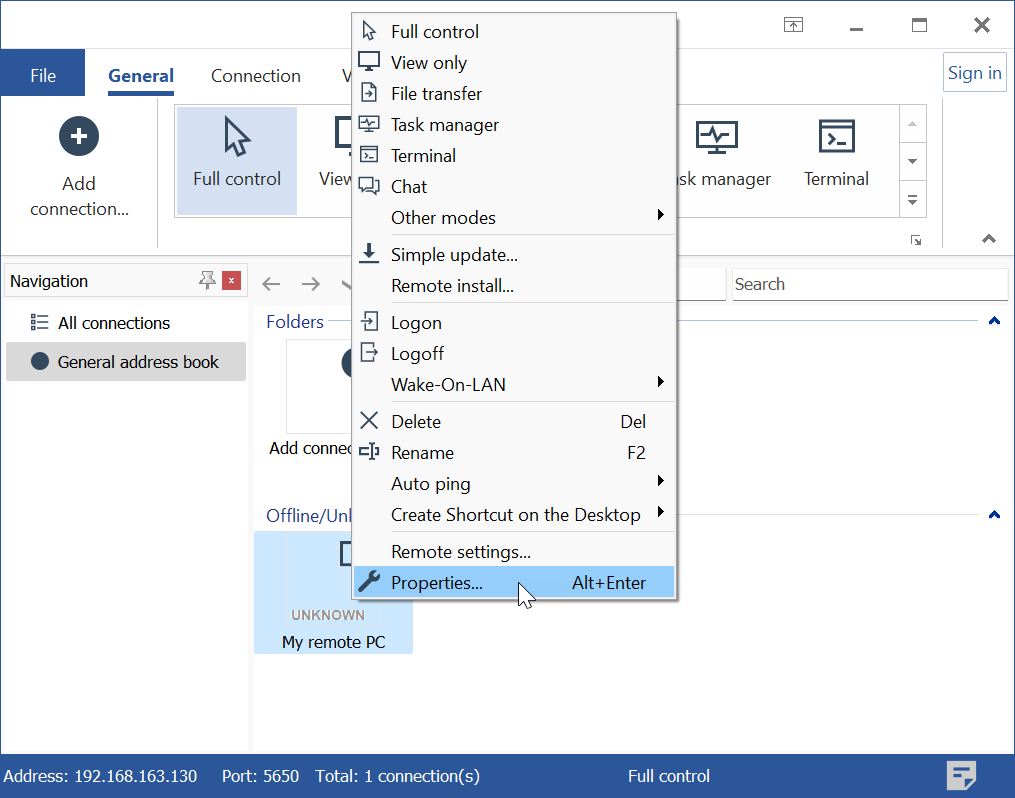- 右键单击 地址簿 中的目标连接,然后选择 属性。