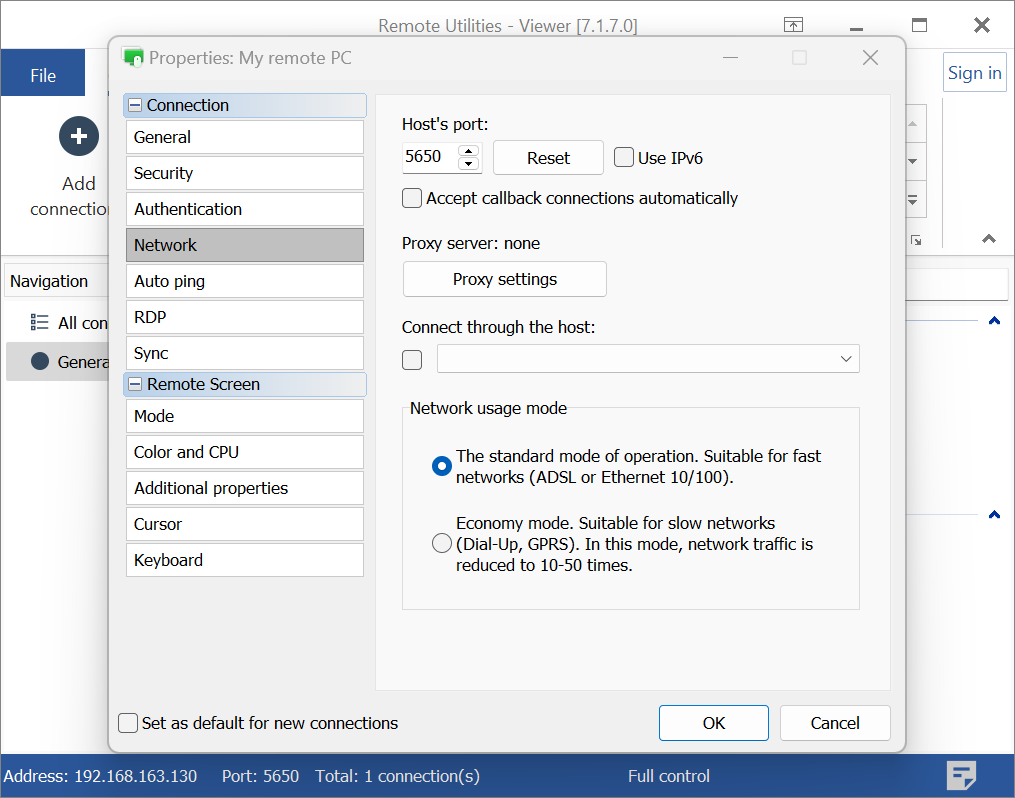 Viewer 端的代理设置是连接特定的,即它们对 地址簿 中的每个连接单独指定。